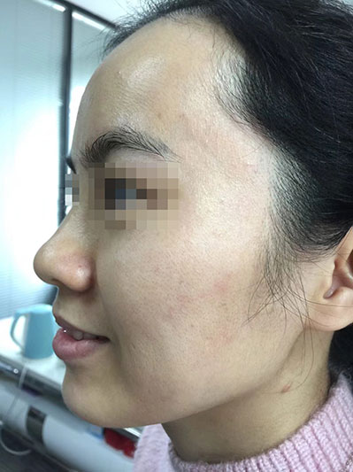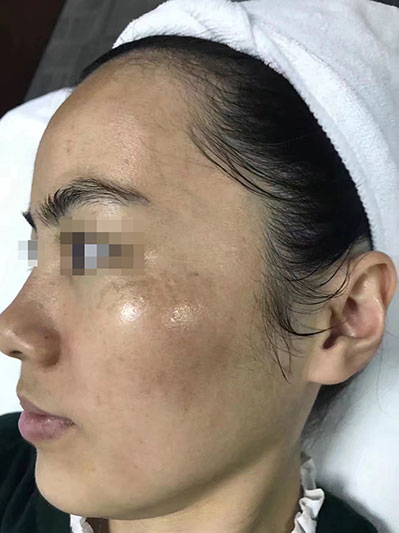 严女士面部肌肤有轻微黄气、两脸颊有黄褐斑。由于平日里经常使用含化学物质的防晒霜,清洗不干净容易堵塞毛孔;再就是做物理防晒比较少,皮肤经强烈的紫外线照射后,黑色素细胞活性增高,分泌的黑色素增多,汗腺不通,很难让色素代谢出体外,时间长了,色素就干涸堆积在表皮层。
